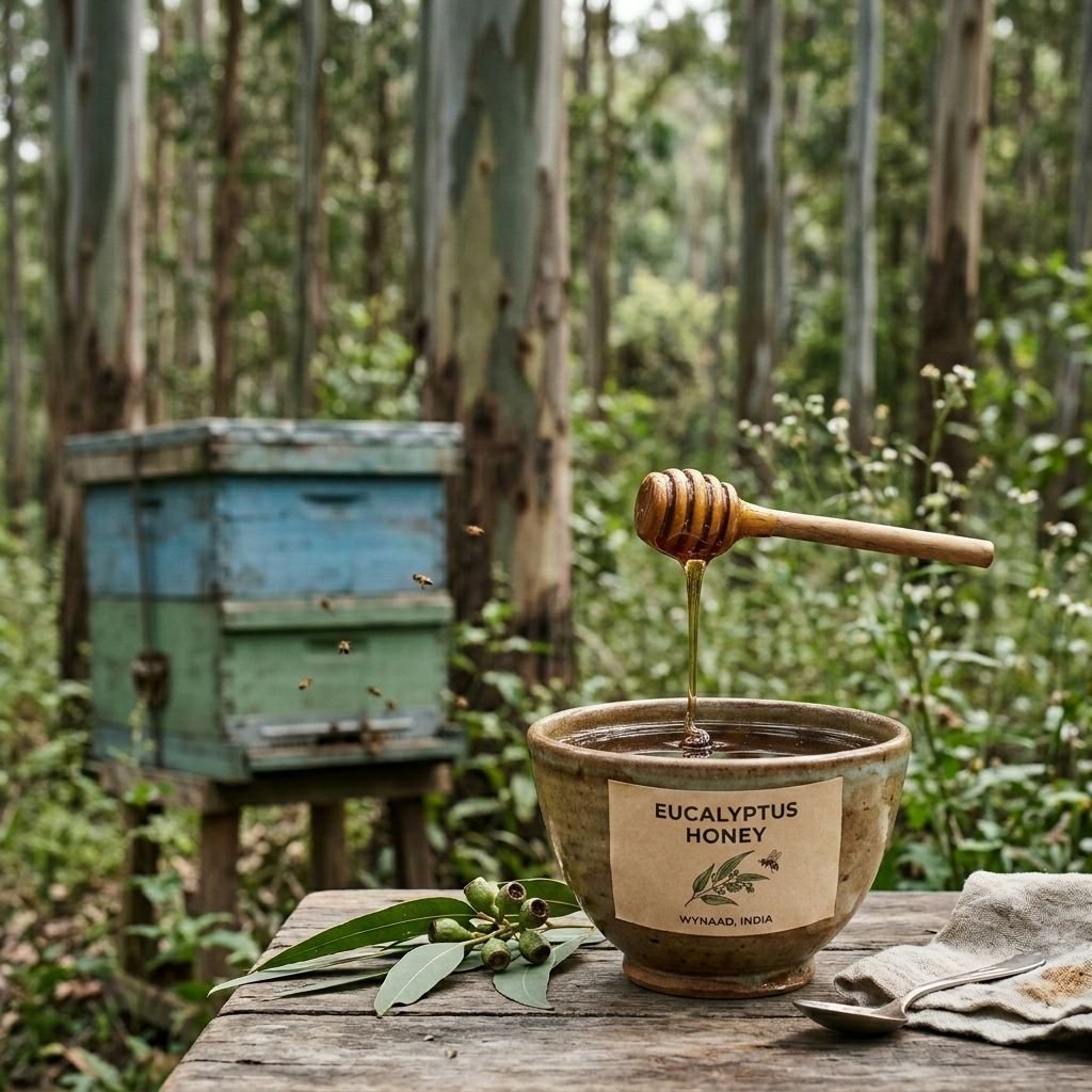 Eucalyptus Honey is made by honeybees from the nectar of the Eucalyptus tree commonly known as Nilgiri. It is aromatic, soft-textured honey which has a light amber colour with a woody warm touch. It has a medium to strong taste with moderate sweetness.